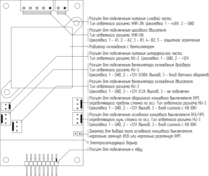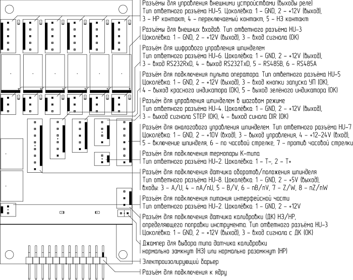 Блок содержит источник питания, плату ядра и платы модулей расширения. Соединительные провода для подключения к ПК и исполнительным устройствам выходят из блока через гермовводы.